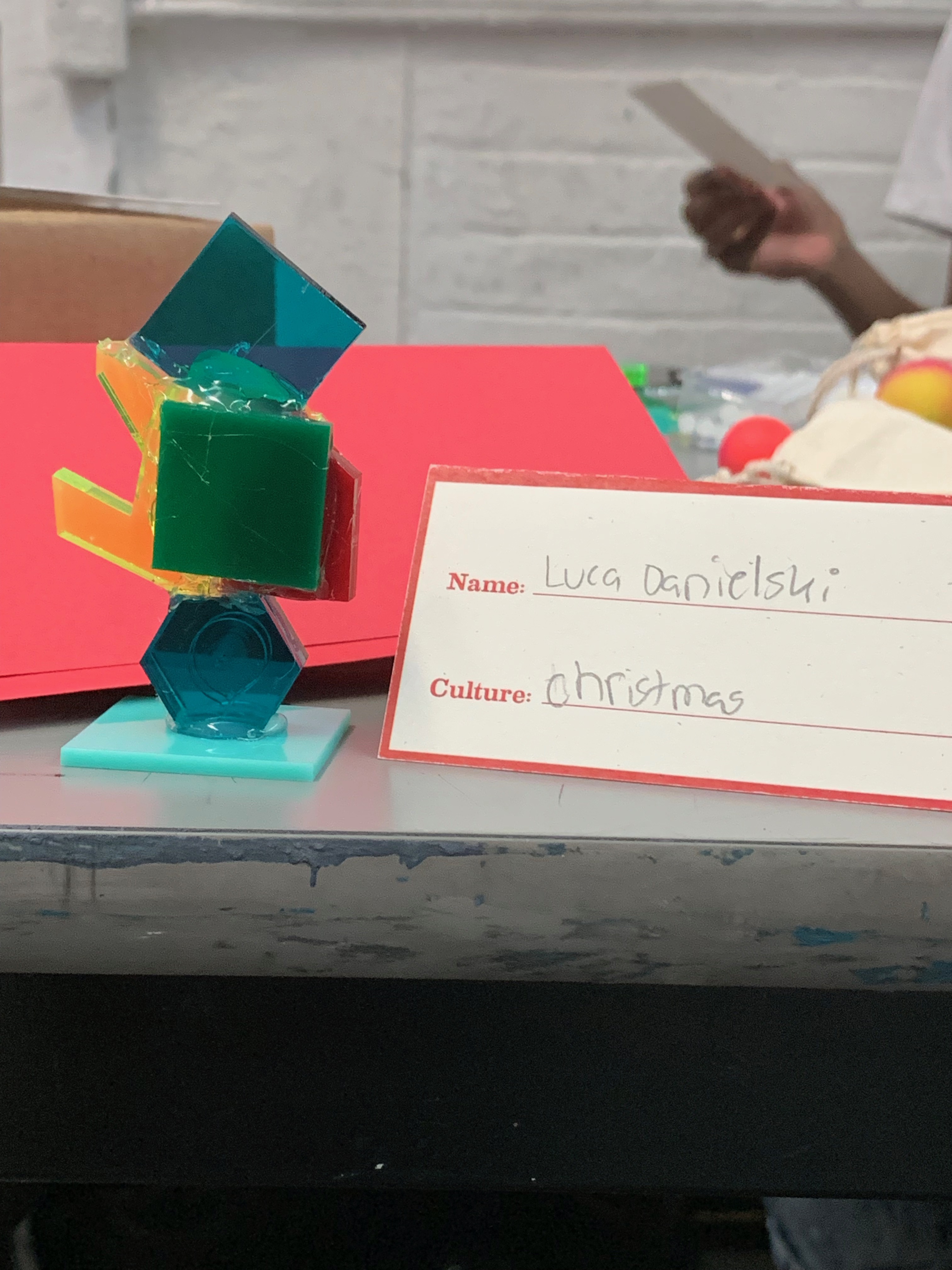 Culture sculpture is a workshop in which participants create an abstract sculpture using geometric and abstract pieces of acrylic, wood, and fabric that embodies a part of their culture. A small card describing what culture can embody and instructions were included in the kit. When assembling each kit I used abstract and geometric pieces of acrylic, wood, fabric in a multitude of colors except black or white. Having the students visualize culture outside of skin color was a goal. Interactivity was encouraged between the students to trade for pieces needed to complete their sculpture.